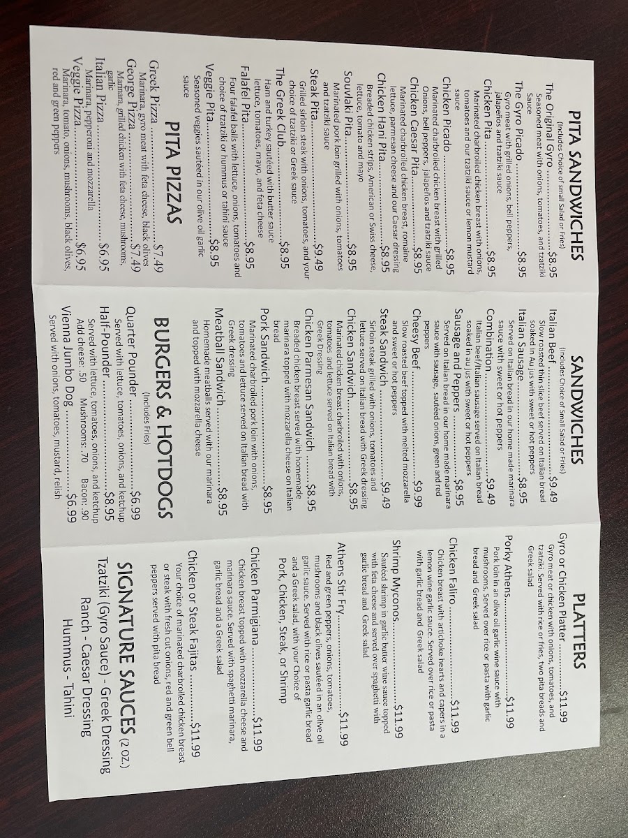 - Dinners: This section offers several plated meals such as Gyro or Chicken Platter, Porky Athens, Chicken Faliro, Shrimp Myconos, and Athens Stir Fry, catering to those looking for a complete main course.
